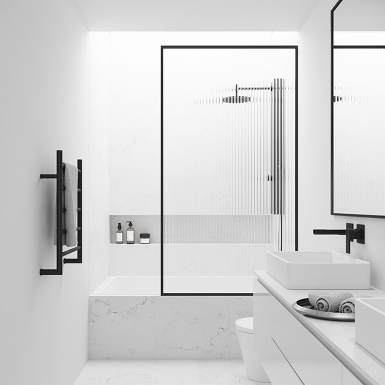 Faucets and shower doors in perfect harmony.
